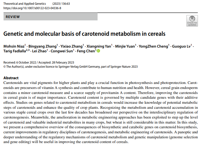 类胡萝卜素是维生素A合成的前体和对人类营养和健康具有重要作用。然而谷物籽粒中的类胡萝卜素含量较少,因此开展类胡萝卜素相关研究具有重要意义。在这项研究中,我们针对类胡萝卜素生物合成通路的基因和分解代谢基因的提出了一个全面的概述,以及现阶段对类胡萝卜素相关基因的改善和相关代谢调控。对类胡萝卜素的调控机制有更深入的代谢了解和遗传操作(基因组选择和基因编辑)将有助于改善谷物的类胡萝卜素含量。英国上市公司官网365博士研究生Mohsin Niaz为论文第一作者,陈锋教授为通讯作者。