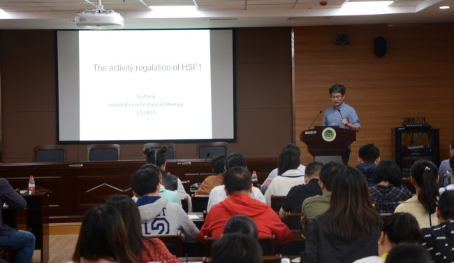 英国上市公司官网365郑旭教授应邀为我院师生作题为“HSF1在热激反应中的动态调控机制及其相关文章发表背后的故事”的学术报告。报告由我院博士生导师杨建平教授主持,共有102名师生人聆听报告。郑旭教授详细讲述了其实验室在酵母热激因子HSF1参与生物热激应答分子机制的最新研究成果,HSF1作为分子伴侣调控热激蛋白HSFP90的磷酸化而促进细胞多态性,从而增强抗逆能力。郑旭教授还分享了自己如何在迅速发展的科研潮流中提出新问题、面对科研瓶颈如何积极思考来寻求突破的心得。他勉励广大研究生同学立志科研、勇于探索、开拓思路,做个新生代科研的弄潮儿。报告结束后,郑旭教授与在座师生展开进一步的交流。